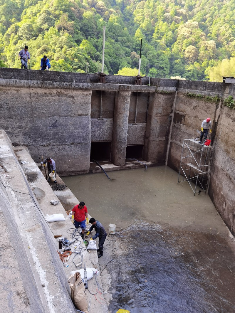 1、确定修补方案 堵漏前必须进行现场调查,摸清混凝土施工质量,分析渗漏水的原因,查清裂缝发生的部位及裂缝的宽度、长度、深度和贯穿情况,并了解雨季和旱季的漏水情况,测量漏水的流量与流速等,通过充分调查,正确拟定