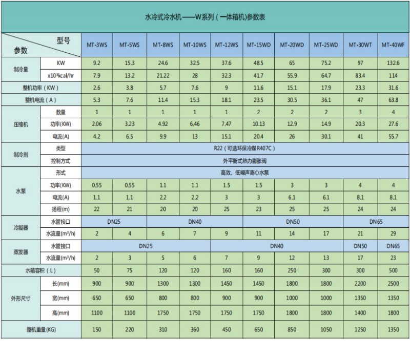 水冷式冷水机:蒸发器中的液态制冷剂吸收水中的热量并开始蒸发,最终制冷剂与水之间形成一定的温度差,液态制冷剂亦完全蒸发变为气态,后被压缩机吸入并压缩(压力和温度增加),气态制冷剂通过冷凝器释放热量是通过冷却塔的水循环散来带走热量。凝结成液体。通过膨胀阀(或毛细管)节流后变成低温低压制冷剂进入蒸发器,完成制冷剂循环过程。再是通过冷水机压缩机的制冷系统冷却循环水,再通过水泵以及冷却水路输送给设备。水冷式冷水机受环境的影响相对较小,但是需要企业有良好的水源供循环冷却,由于配有水塔的原因,水冷式冷水机占用面积较大,安装维护工作量较大,但是制冷量相对稳定。